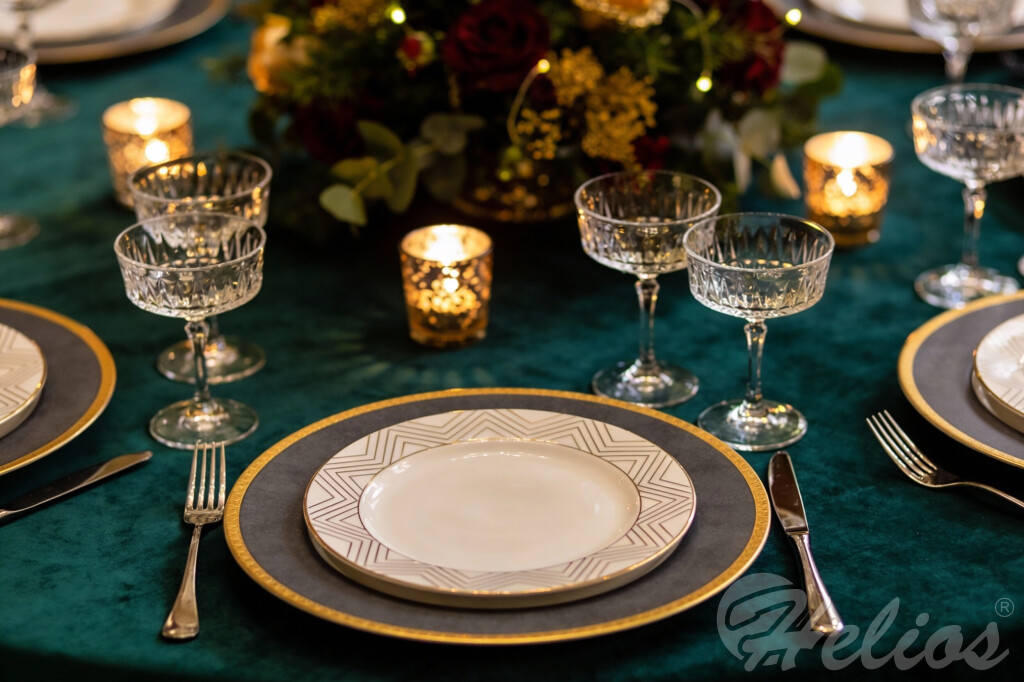 - Talerz bazowy (podtalerz). Jest on tłem, dekoracją dla reszty talerzy. Nie służy jako naczynie, na którym podaje się jedzenie. Jest też ochroną obrusa. Materiał, z którego wykonany jest podtalerz, powinien współgrać z innymi elementami zastawy, dekoracji stołu i wystroju sali. W tym roku sprawdzą się duże, gładkie talerze antracytowe ze złotym rantem.